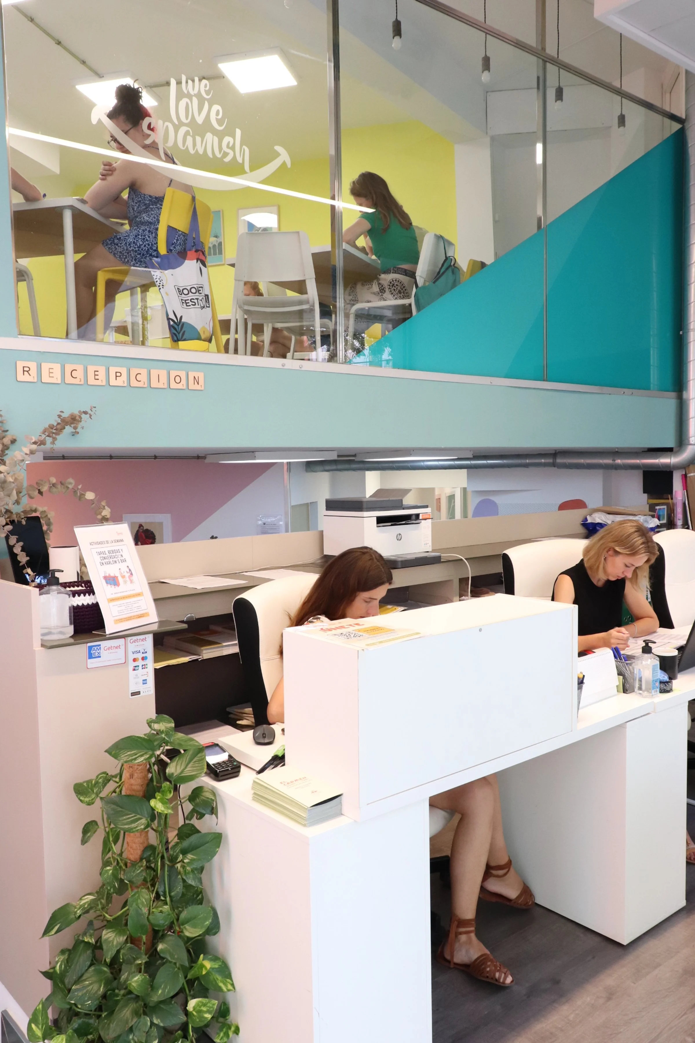 Our school is completely renovated since 2019 to be more functional and also to make our students feel in a warm and comfortable environment to study Spanish. It has 6 spacious classrooms fully equipped with tables, chairs, clock, coat rack, air conditioning and audiovisual players. At the entrance, you will find the reception, where our team will always help you with everything you need with a smile.